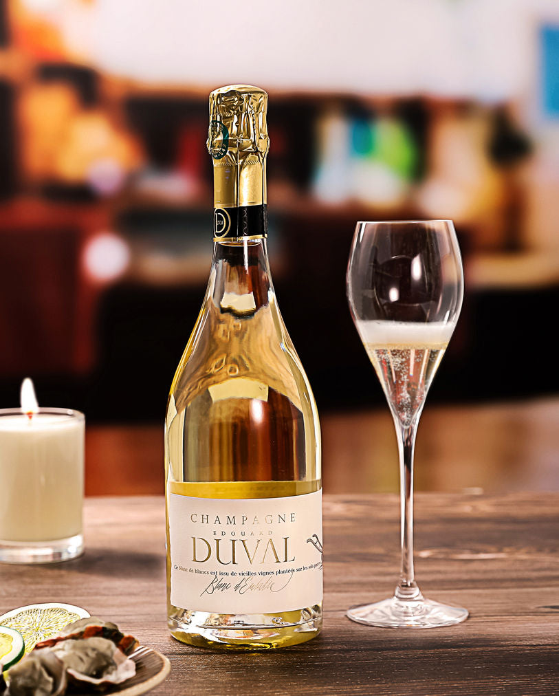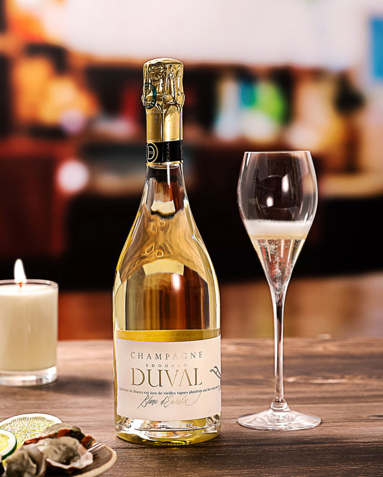 Le nez évoque des odeurs de calcaire fumé et iodé, typique de nos sous-sols, mêlées à des notes de citron et de pêche blanche. L’aération du Champagne permet de révéler des notes de compote de noix de cajou, de beurre, d’amande, avec des accents anisés.